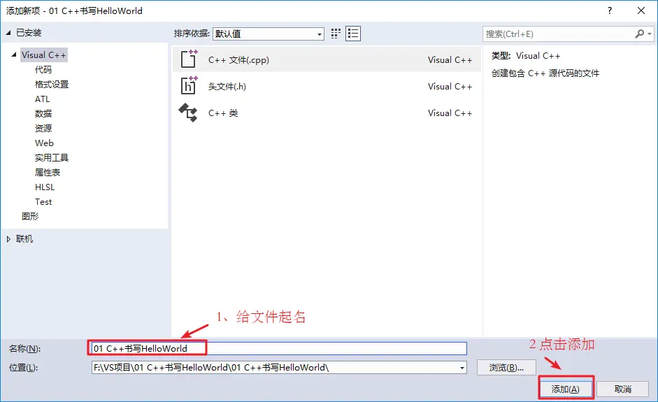 给C++文件起个名称,然后点击添加即可。