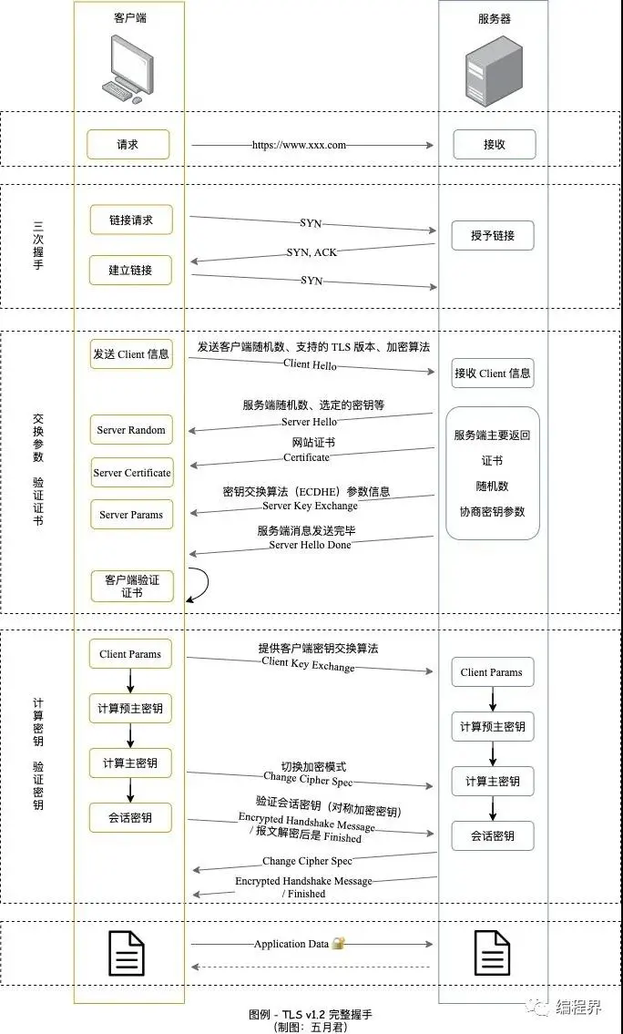 至此,TLS 两次握手就已经完成了,目前客户端和服务端通过明文共享了这几个信息:Client Random、Server Random 、使用的椭圆曲线、椭圆曲线基点 G、服务端椭圆曲线的公钥,这几个信息很重要,是后续生成主密钥和会话密钥的材料。