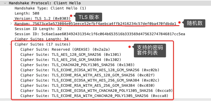 客户端首先会发一个「Client Hello」消息,消息里面有客户端使用的 TLS 版本号、支持的密码套件列表,以及生成的随机数(Client Random)。