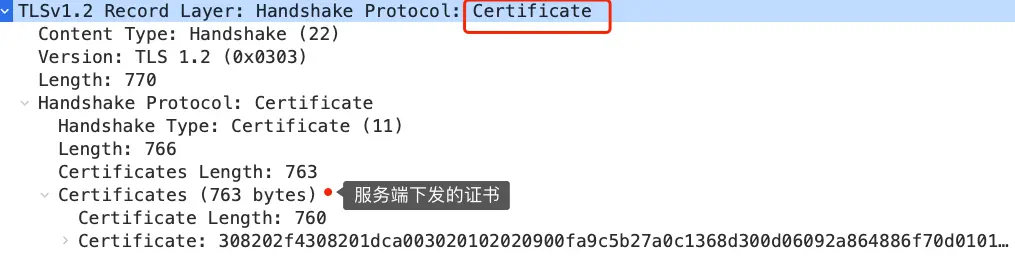 接着,服务端为了证明自己的身份,发送「Certificate」消息,会把证书也发给客户端。