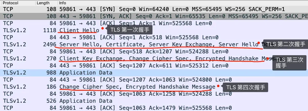 我用 Wireshark 工具抓了用 RSA 密钥交换的 TLS 握手过程,你可以从下面看到,一共经历来四次握手: